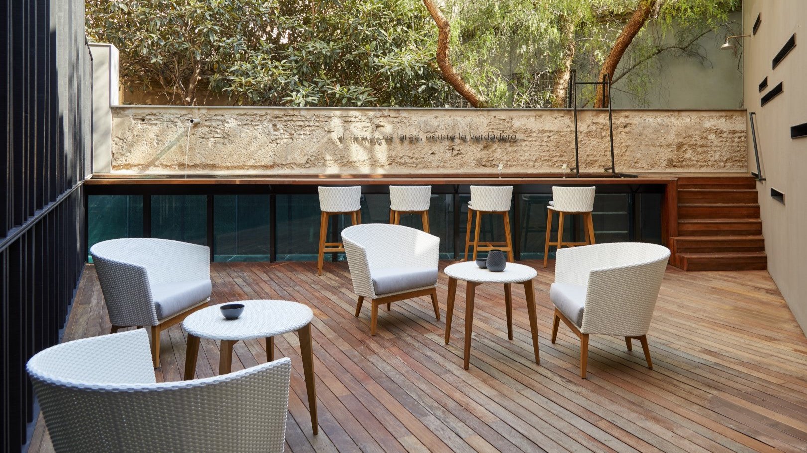 Gabriel Teixidó wanted to create a comfortable yet hard-wearing collection. It had to be modern but with a neutral character that would allow it to fit into any environment. He chose to use a traditional weave in the recyclable Shintotex fibre, developed by POINT, to create the seats and backrests, which he combined with legs made of teak wood from sustainably managed forests and a polyurethane foam cushion that is made to withstand the elements. He has managed to achieve a contemporary collection with classic details. Arc consists of chairs, stools, armchairs, coffee tables and corner tables. The side tables can be customised with tops made from different materials, including porcelain, HPL and teak.