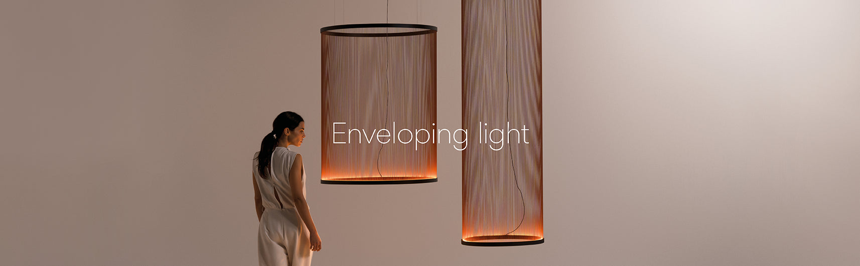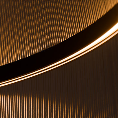 The spacing distribution of the threads creates translucency and volume, whilst the layering effect gives the illusion of movement. Suspended overhead, Array emits a pleasant downlight projected from an invisible source concealed within the lower ring.