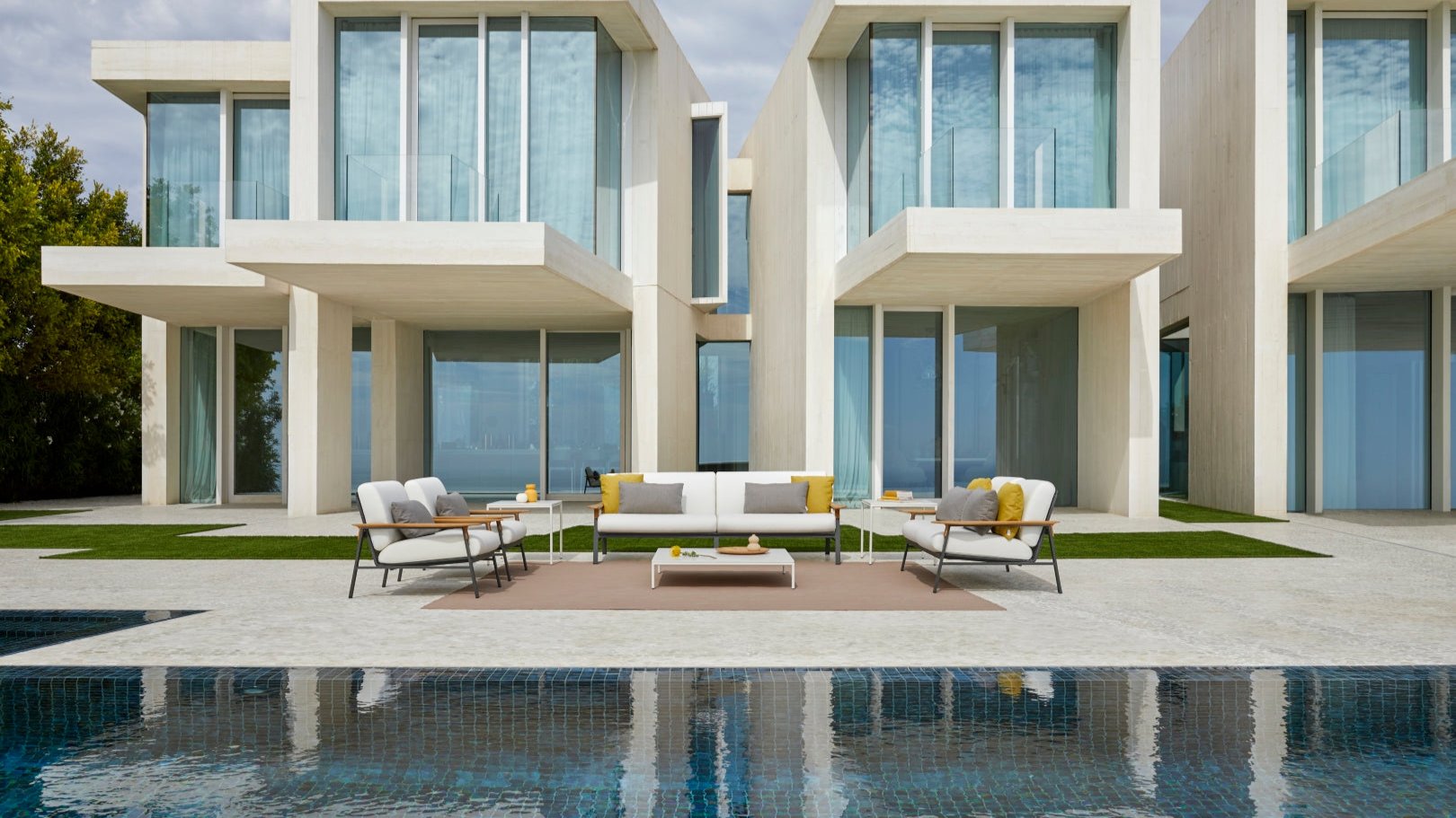 “This collection is my contemporary take on the art of Mediterranean living, which is unconnected to time. It is a universe where the sun and the earth meet”. Its main feature is a powder painted aluminium structure with teak arms and plump, comfortable cushions. These pieces create a composition of great comfort and harmony. The seats in the collection, an armchair, a double sofa and a triple sofa, exude classicism and elegance, and their cushions can be customized in terms of both prints and colors. The collection is complemented by four tables: two coffee tables and two corner tables.
