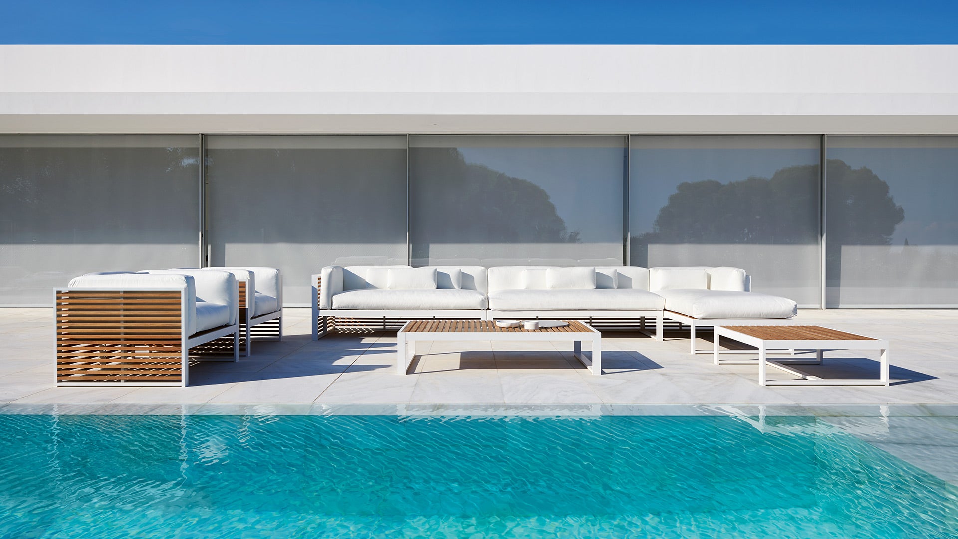 The warmth and naturalness of teak wood contrast with the coldness of the aluminium that frames the furniture, GANDIABLASCO’s fetish material. Its chestnut tones combine with the anodized aluminium colour as well as with all the powder-coated finishes available in this collection.