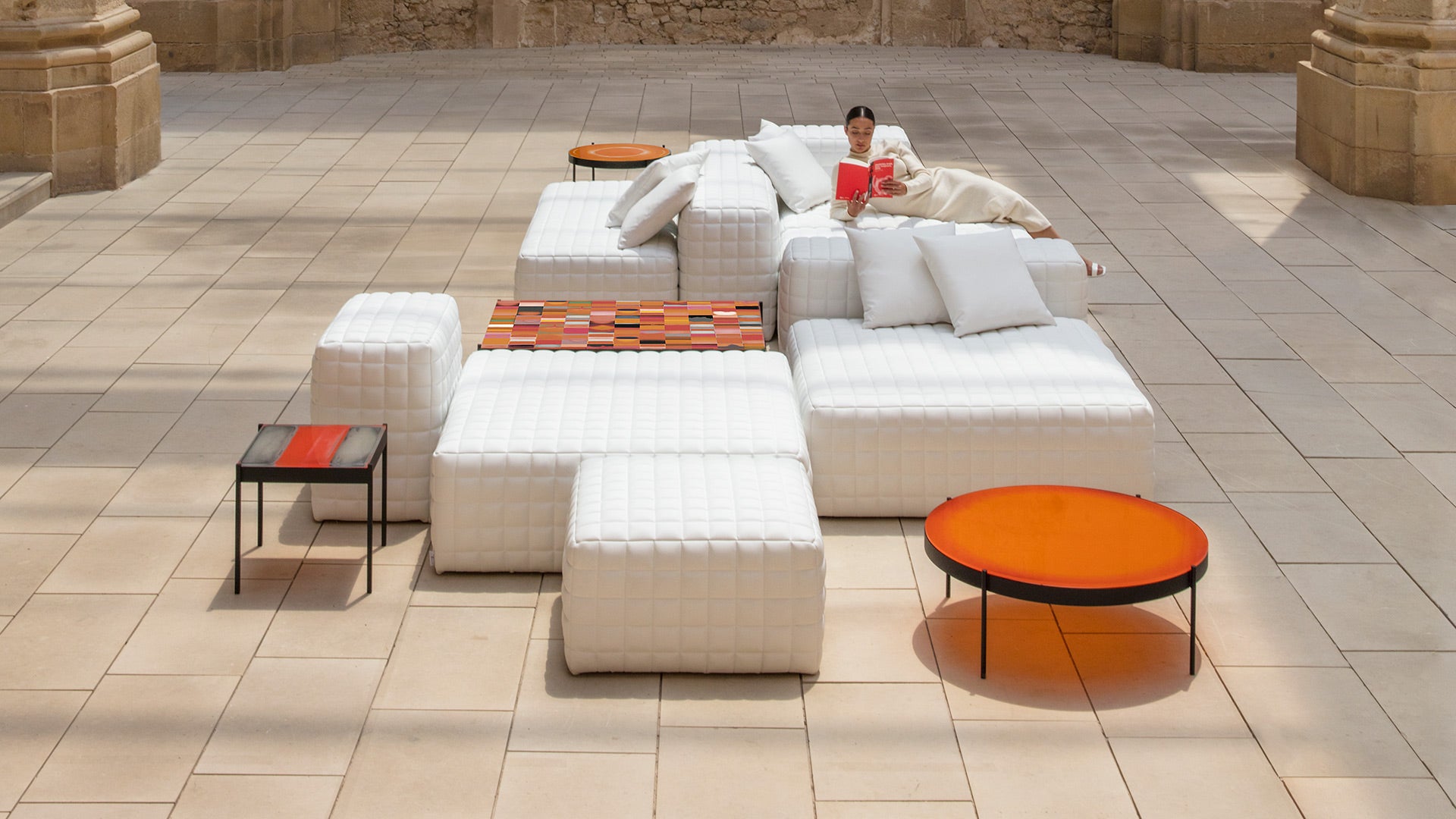 ERNO adapts the concept of the indoor sofa to outdoor use too. It is a collection of versatile poufs upholstered in quilted, grid-shaped fabric, that are joined together to create different seating arrangements. The series is completed by other pieces identical to the poufs, but they are taller so they act as armrests and backrests. As well as providing comfort, these multiply the possibilities for building different environments.