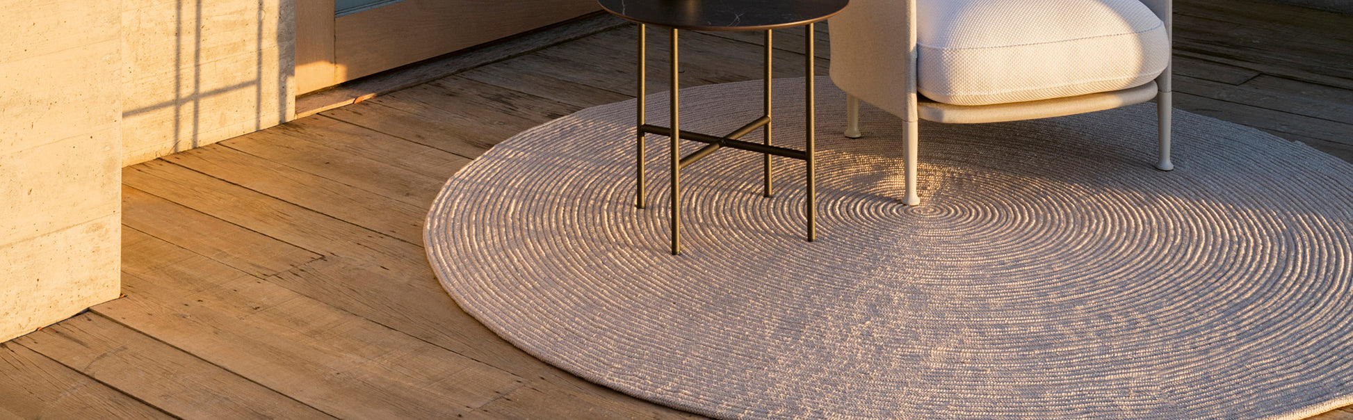 “Espiral. A curve which emanates from a point, moving farther away as it revolves around the point. It is precisely the pattern dominating this simple round rug, made of polyester rope and hand sewn from the centre just like the spiral inspiring it. The material along with the spinning design helps create an attractive visual effect.”