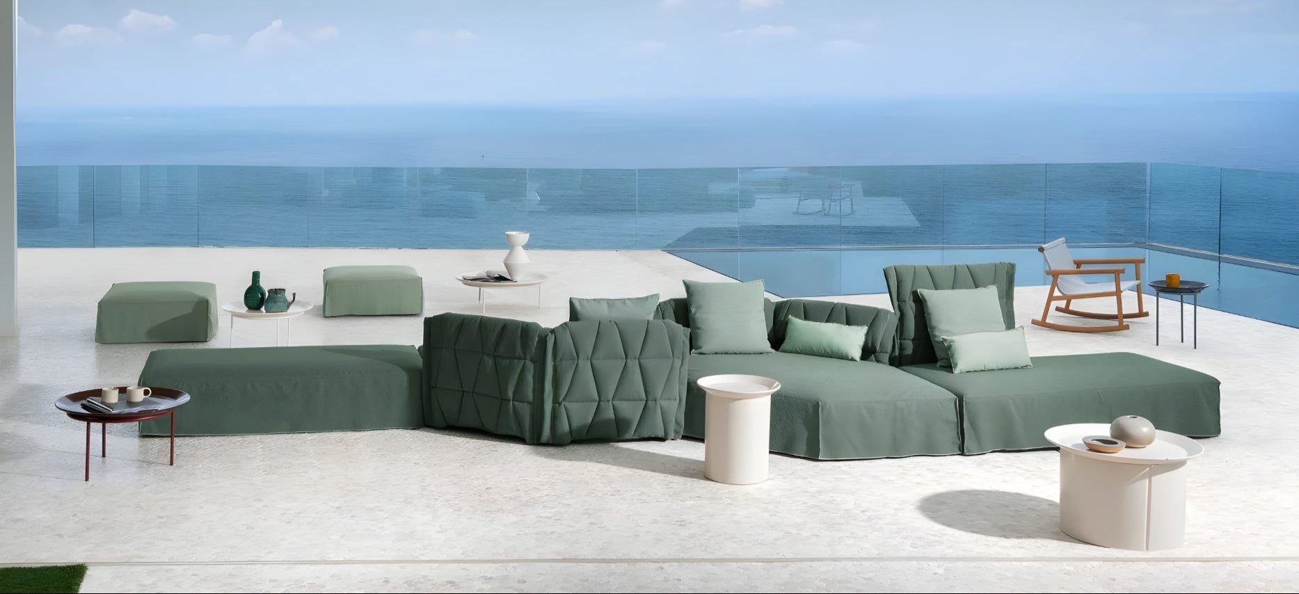 Flair, by Gabriele and Oscar Buratti, is a modular system of sectional seating and backrests in countless forms and dimensions. Informal, soft and at the same time elegant, Flair is characterized by a backrest covered with a quilted fabric that can be flipped-down defining and mixing up the skyline. The collection also includes a day-bed with a adjustable backrest and mattress with a removable quilted cover.