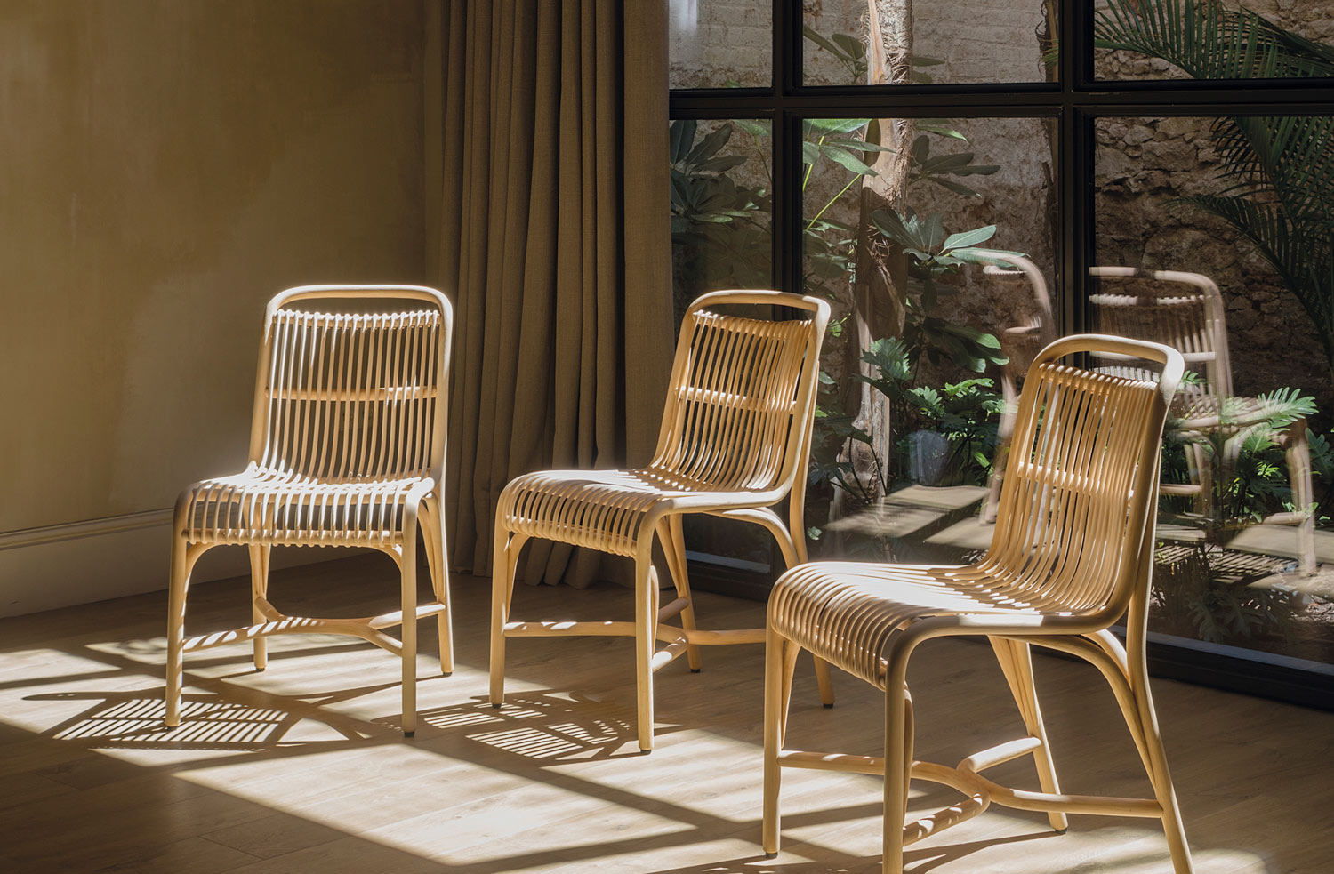 Gata originates from a thorough search for balance between the different elements, shapes and diameters of the rattan cane in order to produce a comfortable and resistant seating, as well as an aesthetically harmonic one.