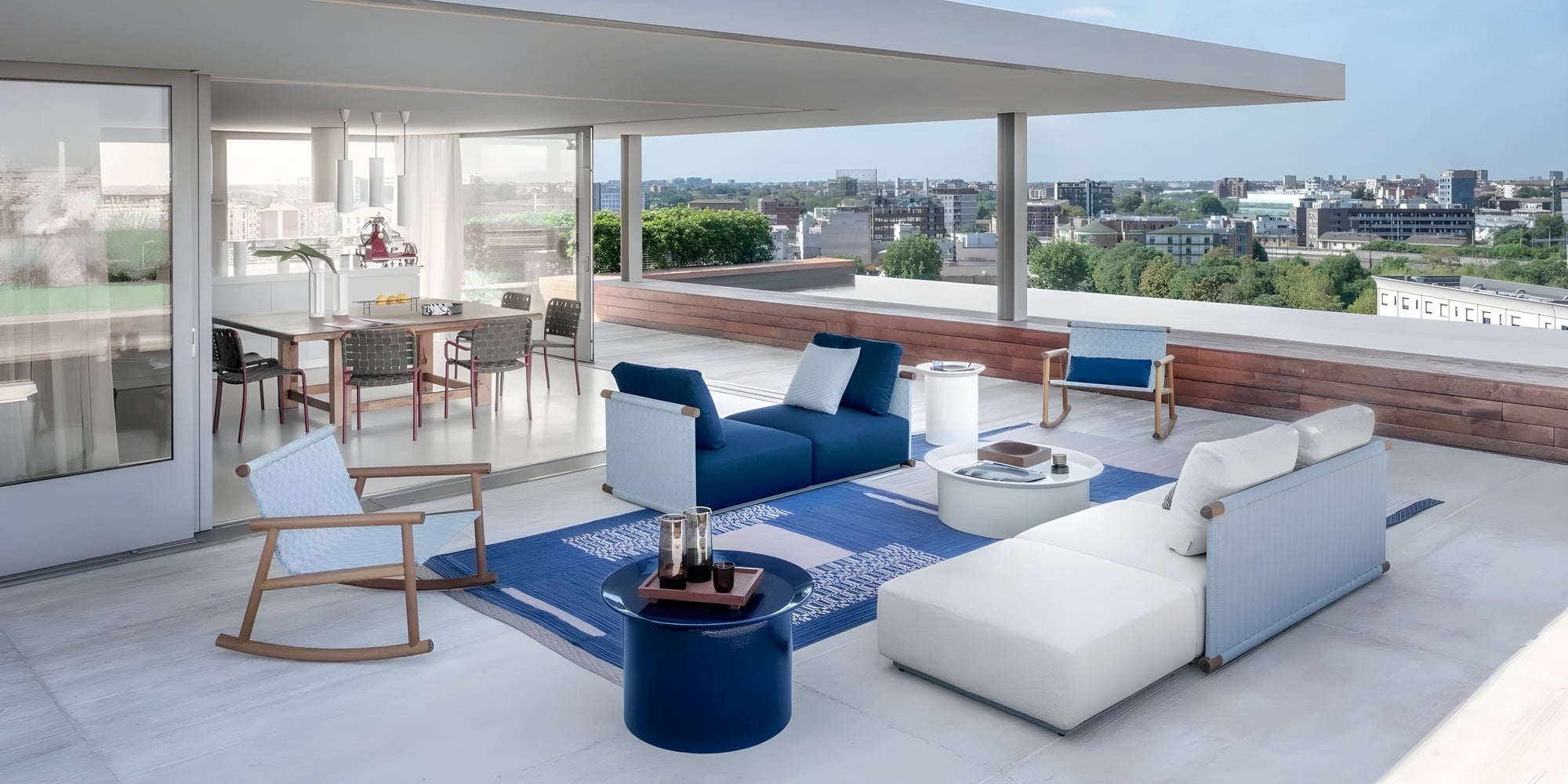 Rocking chair with iroko structure and steel frame, treated for the outdoors. The Accardi Outdoor Jacquard technical fabric, which wraps and envelops the iroko wood elements at the bottom and at the top, is a sustainable, lightweight, waterproof fabric carefully crafted by artisan weavers. The result creates a textured pattern that blends harmoniously with the wooden structure with irregular cross-section, once again highlighting the reference to Japonisme and the local craft tradition.