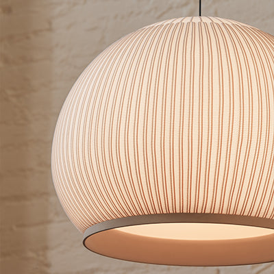 Featuring three large pendants, the Knit collection reimagines the traditional lampshade, transforming it into a contemporary look. Light seeps through the fabric outwards and downwards through a translucent diffuser, bathing the surrounding space in an intimate glow. The distinctive geometry and meticulous craftsmanship of each silhouette are complemented by a seamless transition between fabric, diffuser, and aluminum ring casing.