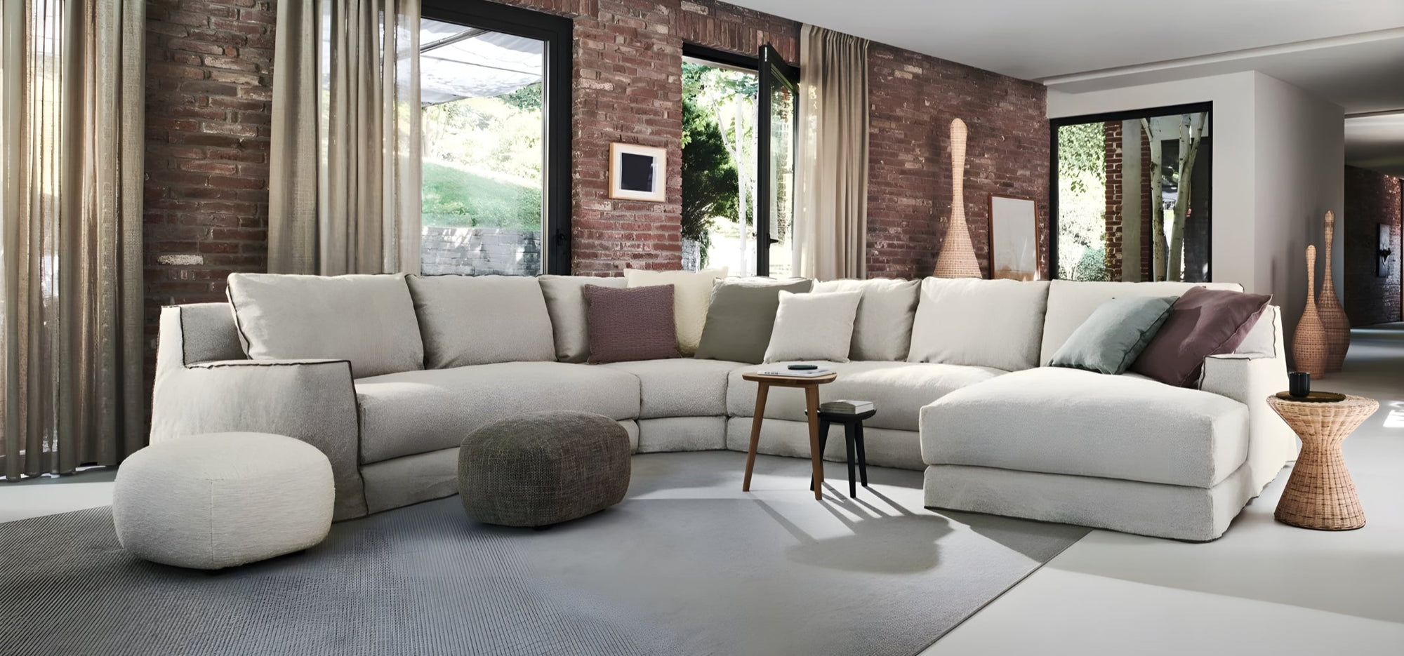 A proposal that tells a story of contemporary comfort, made special by the attention to detail, the quality of the materials and the uniqueness of the craftsmanship, such as the profile of the sofas underlined by the characteristic sew/cut seam which, like a light line drawn by hand, follows the essential geometries and soft lines of the collection. The solid wood structure with polyurethane foam shell is combined with large seat and back cushions made with a soft layer of channelled goose down, recovering the traditional technique of using pocket springs in the seat cushions for enhanced comfort. In all its versions, the covers of the LOLL collection are completely and easily removable.