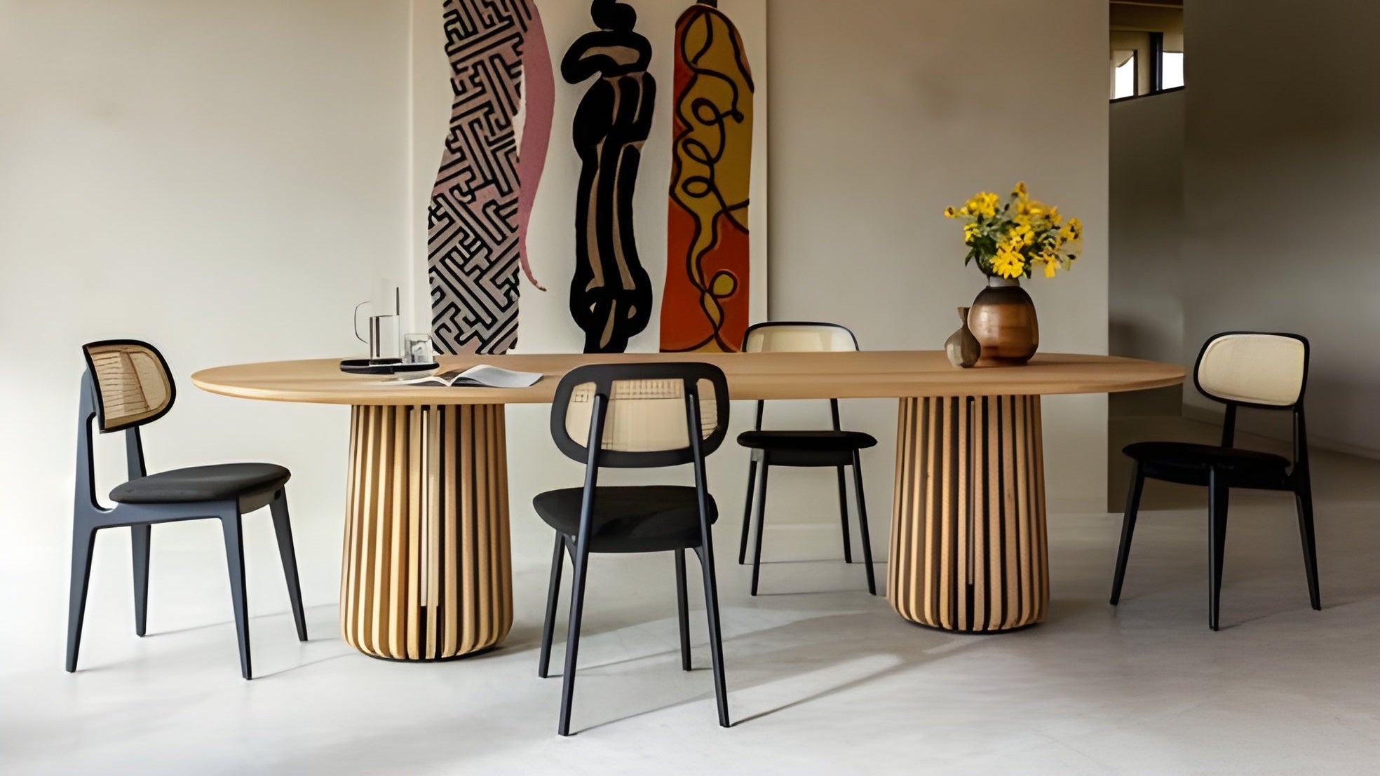 Maru is a collection of oak dining tables characterized by a handcrafted base made with slats. The interplay between the smooth solid oak top and the open structure of the base creates a simple yet strong aesthetic for the table. Opt for an oval dining table or round dining table to suit your place best.