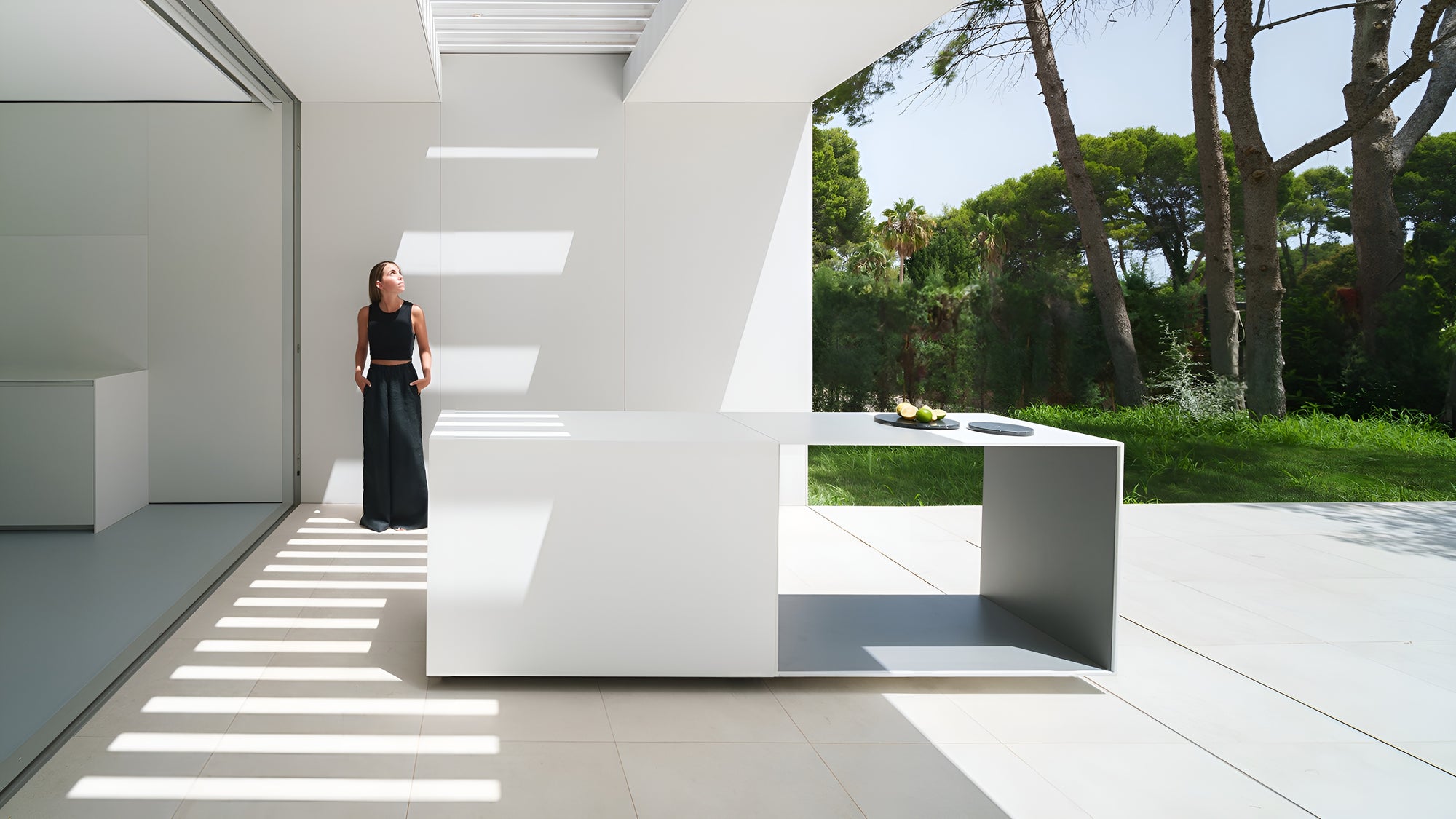 The new NEDRA outdoor kitchens are a design born from the collaboration between GANDIABLASCO and Porcelanosa, signed by the Valencian architect Fran Silvestre. A very innovative proposal at an aesthetic and technical level, due to its essential and light design, which incorporates a novel table-like module as well as a hidden induction system, in which the hobs are integrated into the countertop providing a uniform surface when not in use. NEDRA is a kitchen born not to be perceived as such, which blends into the environment and looks like just another piece of furniture, so when it is revealed as a kitchen it is surprising.