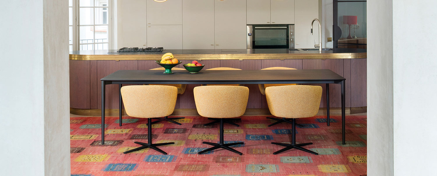 Cut loose the unnecessary to find the beauty of simplicity: in the form, reduced to basic geometric figures; in the design, intentionally austere, but made explicit through subtle details such as the cone-shaped legs or the tabletop beveled edge; and in the materials, essentially strong to secure its persistence. The beauty and honesty of a nude.