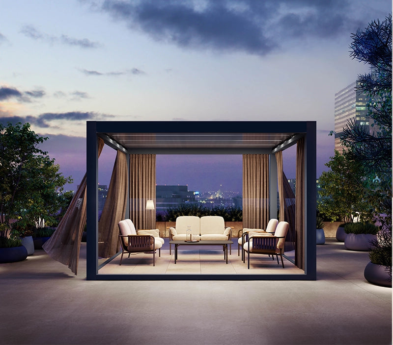 A modular pergola system designed for modern outdoor spaces, offering customizable shade, lighting, and enclosure options to create functional and stylish open air environments.